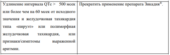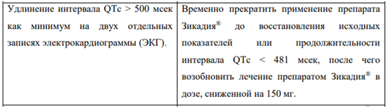 В клинических исследованиях у пациентов, принимавших препарат Зикадия, наблюдались случаи удлинения интервала QTc, которое может приводить к желудочковой тахиаритмии (например, к желудочковой тахикардии типа «пируэт») или внезапной смерти (см. раздел «Побочные действия»). При централизованном анализе данных ЭКГ впервые возникшее удлинение интервала QTc > 500 мсек было выявлено у 12 пациентов (1,3 %), у 6 из которых отмечалось увеличение интервала QTc > 450 мсек от исходного значения. У 58 пациентов (6,3 %) отмечалось удлинение интервала QTc на > 60 мсек от исходного значения. Фармакокинетический/фармакодинамический анализ позволяет предположить, что церитиниб вызывает дозозависимое удлинение интервала QTc. Следует избегать применения препарата Зикадия у пациентов с синдромом врожденного удлинения QT, а также соблюдать осторожность при применении препарата у пациентов с удлинением интервала QT, в том числе в анамнезе, или предрасположенностью к удлинению интервала QT, хронической сердечной недостаточностью, брадиаритмией, нарушениями водно-электролитного баланса, а также у пациентов, принимающих антиаритмические и другие препараты, удлиняющие интервал QT. Рекомендуется проводить периодический контроль ЭКГ и содержания электролитов (например, калия) у пациентов данной категории. По клиническим показаниям при возникновении рвоты, диареи, дегидратации или нарушений функции почек следует проводить коррекцию водно-электролитного баланса. Следует прекратить применение препарата Зикадия при удлинении интервала QTc > 500 мсек или более чем на 60 мсек от исходного значения, а также при развитии желудочковой тахикардии типа «пируэт» или полиморфной желудочковой аритмии или при наличии симптомов/признаков развития аритмии тяжелой степени. Необходимо временно прекратить применение препарата Зикадия® у пациентов с удлинением интервала QTc > 500 мсек до восстановления исходных значений или до уменьшения длины интервала QTc < 481 мсек по данным, по крайней мере, двух измерений ЭКГ, а затем возобновить применение препарата Зикадия в дозе, сниженной на 150 мг.