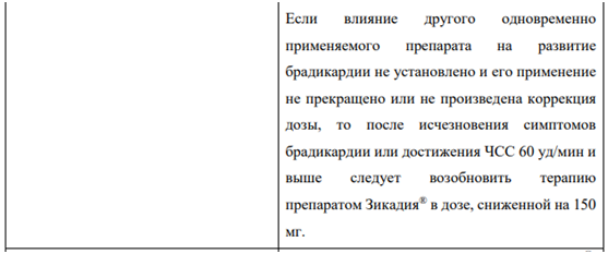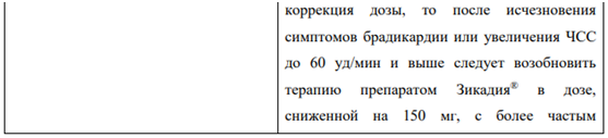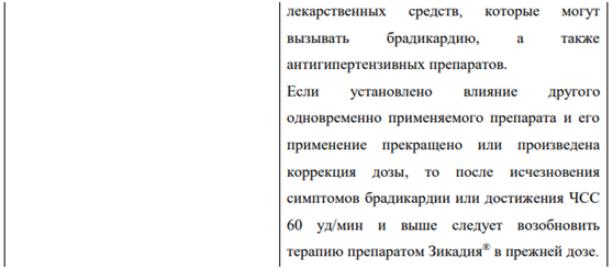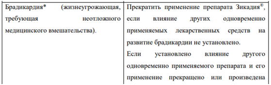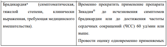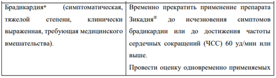 Брадикардия В клинических исследованиях у пациентов, принимавших препарат Зикадия, наблюдались случаи развития брадикардии (см. раздел «Побочные действия»). Следует, по возможности, избегать одновременного применения препарата Зикадия и других препаратов, способных вызывать брадикардию (в том числе бета-адреноблокаторы, недигидропиридиновые блокаторы «медленных» кальциевых каналов, клонидин, дигоксин). Необходимо регулярно контролировать ЧСС и артериальное давление (АД). При возникновении симптомов брадикардии (не являющейся жизнеугрожающей) необходимо временно прекратить применение препарата Зикадия® до их исчезновения или до восстановления ЧСС до 60 уд/мин и более, оценить влияние одновременно применяемых препаратов, способных вызывать брадикардию, и при необходимости снизить дозу препарата Зикадия. Следует прекратить применение препарата Зикадия в случае развития жизнеугрожающей брадикардии, если влияние других препаратов на развитие брадикардии не установлено; однако если установлено влияние других одновременно применяемых препаратов на развитие брадикардии, необходимо временно прекратить применение препарата Зикадия до исчезновения симптомов брадикардии или до достижения ЧСС 60 уд/мин и более, и после коррекции дозы одновременно применяемых препаратов или после их отмены возобновить лечение препаратом Зикадия в дозе, сниженной на 150 мг, с более частым контролем состояния.