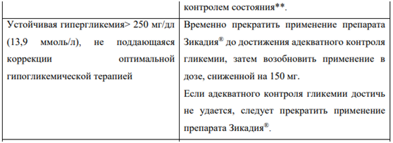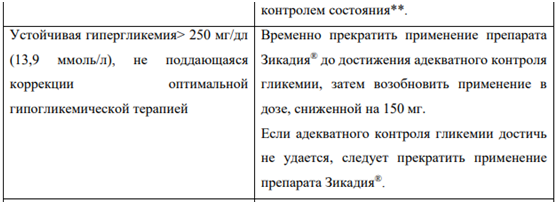 В клинических исследованиях менее чем у 10 % пациентов, принимавших препарат Зикадия®, отмечались случаи развития гипергликемии (любой степени тяжести). У 5,4 % пациентов отмечалось развитие гипергликемии 3-й и 4-й степеней тяжести (см. раздел «Побочные действия»). Риск развития гипергликемии выше у пациентов с сахарным диабетом и/или принимающих глюкокортикостероиды. Следует контролировать концентрацию глюкозы в сыворотке крови натощак до начала терапии препаратом Зикадия, а также периодически в процессе лечения по клиническим показаниям. При необходимости следует начать или скорректировать гипогликемическую терапию.