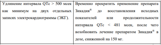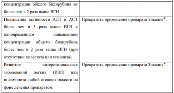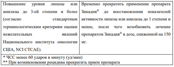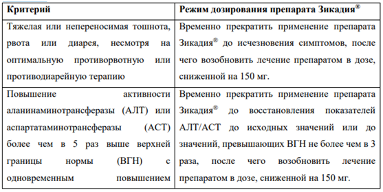 В Таблице 1 суммированы рекомендации по временному прекращению, снижению дозы или прекращению применения препарата Зикадия при выявлении отдельных НЛР.