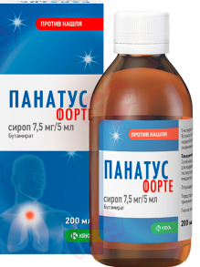 Сироп, противокашлевое средство центрального действия. Подавляет кашель, обладая прямым влиянием на кашлевой центр.Торговое наименование: Панатус® форте