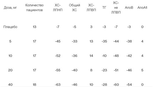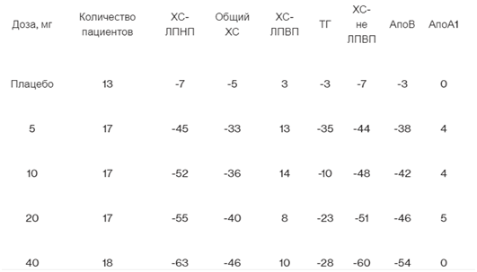 Таблица 1. Зависимость ответа на лечение от дозы розувастатина у пациентов с первичной гиперхолестеринемией (типы IIa и IIb по Фредриксону)